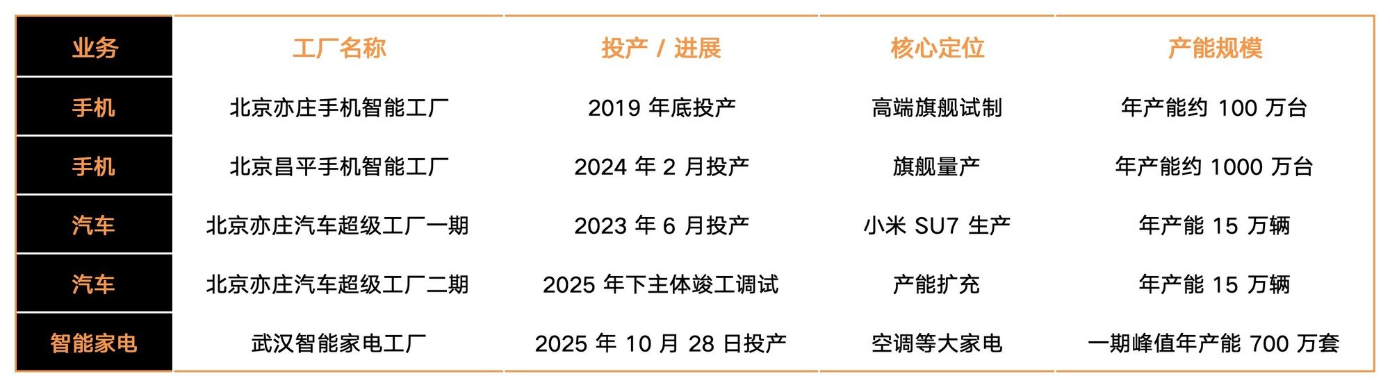图:2025年10月投产的小米武汉智能家电工厂,峰值年产能达700万台空调,每6.5秒即可下线一台这座工厂的意义,在于让小米第一次在“冷家电”上拥有了从研发、试制到量产的完整闭环。它和北京亦庄的汽车工厂、昌平的手机工厂一起,构成人车家三条线背后的制造底盘。家电这条线原本被视作手机生态的延伸,2025年开始,它自己也有了足够的业务体量和技术含量,可以在财报里成为单独讨论的支柱板块。