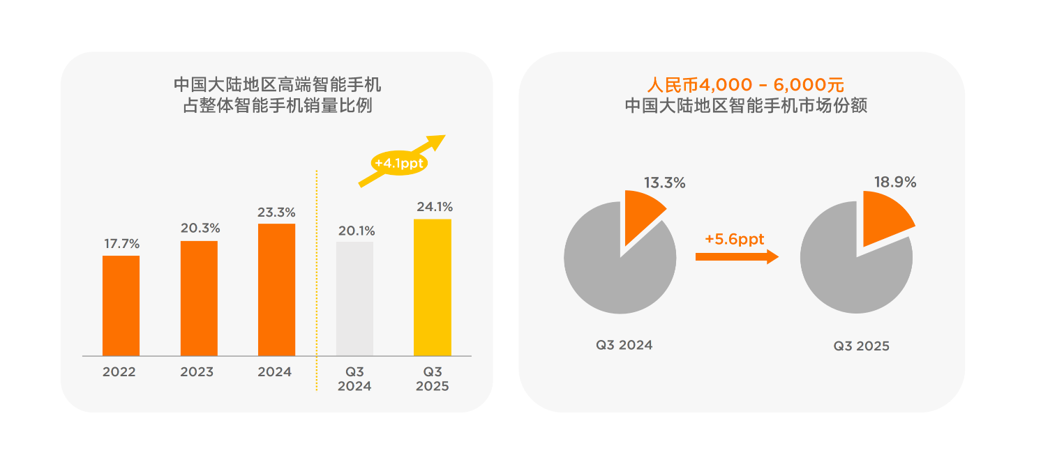 中国市场则是另一条曲线。2025年,小米在国内4000元以上价位段的销量占比抬升到约四分之一,高于前几年一度陷入的“价位段天花板”(小米)。在4000–5000元价位,小米部分季度份额接近四分之一;在5000元以上区间,也逐渐有了存在感。高端机不再只是“偶尔爆款”,而是变成了结构性组成部分。