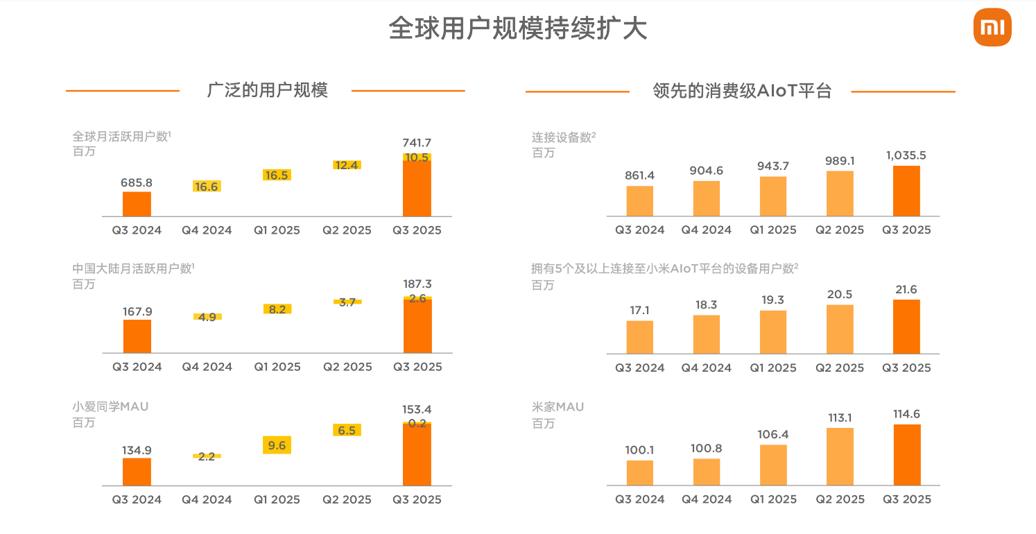 自2013年布局智能硬件生态链以来,小米已逐渐构建起全球最大的消费级IoT平台。2025年第三季度,小米AIoT平台已连接的设备数(不含手机、平板、笔记本)正式突破10亿台大关。这一数字相较几年前实现了数量级的跨越——截至2023年底,小米IoT连接设备约6.24亿台,两年不到增长了近四成。
