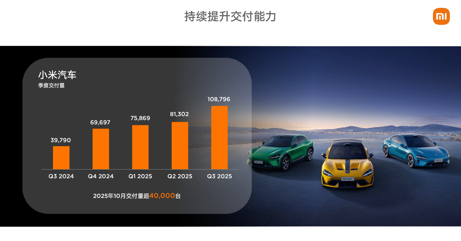 从销量看,小米在2025年把“能造车”这件事情拉到了量产和规模的层级。第三季度,小米智能电动汽车交付10.88万辆,单季创下新高;前三季度累计交付超过25万辆,全年预计突破40万辆关口。这一节奏放在中国新能源车市场,也是少数能拿出说服力的增速曲线。